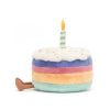 Celebrate in color with Amuseable Rainbow Birthday Cake! This joyful cake has four soft layers in pink, purple, yellow and green, fluffy icing with chocolate flecks and a suedette stripe candle with a golden fur flame. Kick up those cord boots and dance!