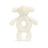 In two shakes of a lamb’s tail, Baby will be giggling away! The Bashful Lamb Ring Rattle is soft in a vanilla cream fur made with recycled fibres. Easy to grab with four soft hooves and a ring-shaped tummy, the rattle gently jangling when shaken. With a sweet, embroidered face and cute waggle ears, it’s just the friend for long country trips.